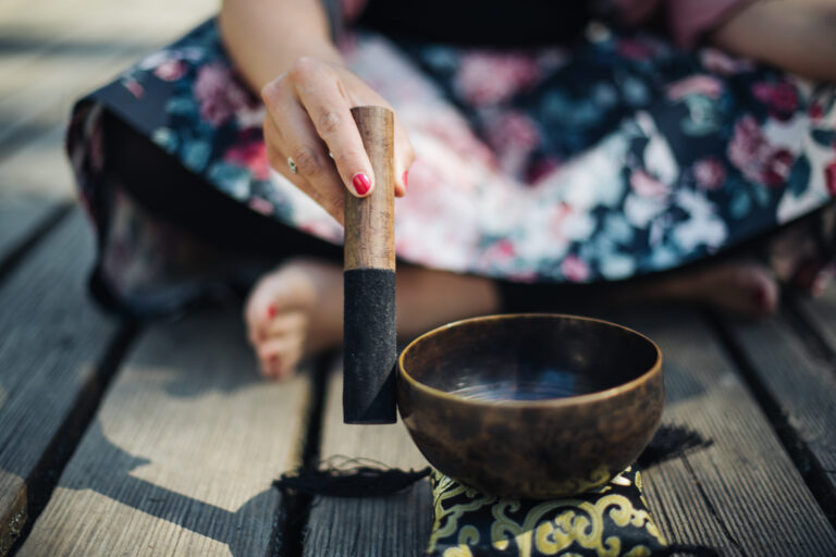 Ich habe zum Beispiel von einer meiner engsten Freundinnen eine geschliffene Holzplatte mit dem eingebrannten Wort „Stille“ als Teelichtuntersetzer geschenkt bekommen. Diese steht vor einer Vase mit frischen Rosen, rechts daneben meine Buddha-Statue und links daneben eine kleine Engelfigur. Bevor ich mit der Meditation beginne, schalte ich mein Handy aus, schließe die Türen meines Wohnzimmers und zünde die Kerze an. Manchmal läute ich noch kurz meine Klangschale, als Signal, dass die Meditation gleich beginnt.